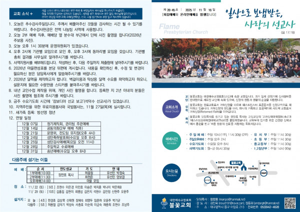 25.11.16. 주보 페이지 정보 작성자 불꽃교회 작성일25-11-15 14:47 조회11회 댓글0건 목록 본문 25.11.16. 주보 페이스북 공유 트위터 공유 구글+ 공유 댓글목록 등록된 댓글이 없습니다. 목록