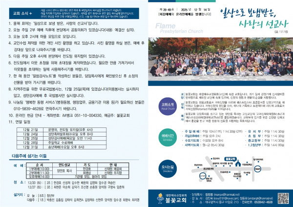 25.12.14. 주보 페이지 정보 작성자 불꽃교회 작성일25-12-12 13:22 조회20회 댓글0건 목록 본문 25.12.14. 주보 페이스북 공유 트위터 공유 구글+ 공유 댓글목록 등록된 댓글이 없습니다. 목록