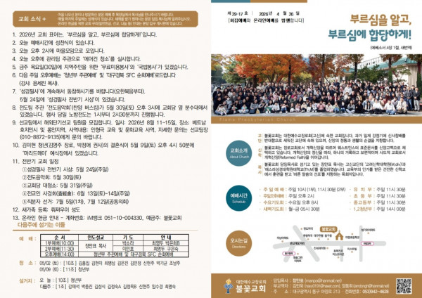 26.4.26. 주보 페이지 정보 작성자 불꽃교회 작성일26-04-25 15:01 조회6회 댓글0건 목록 본문 26.4.26. 주보 페이스북 공유 트위터 공유 구글+ 공유 댓글목록 등록된 댓글이 없습니다. 목록